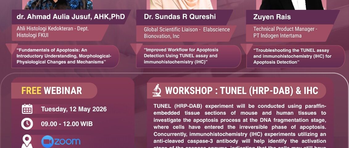 Kami mengundang peneliti, akademisi, klinisi, dan umum untuk berpartisipasi dalam Webinar (Gratis) dan Workshop Hands-On mengenai Imunohistokimia (IHK/IHC) dan uji TUNEL dalam investigasi apoptosis: